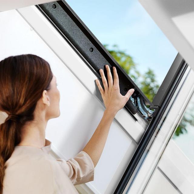 Центрально-поворотне мансардне вікно Velux Стандарт Плюс GLU 0061 відкривається та закривається за допомогою фірмової ручки-планки у верхній частині, яка є авторською розробкою компанії Велюкс та унікальною технологією у своєму роді. Ручка вгорі дозволяє зручно відкрити мансардне вікно, навіть якщо під ним стоять меблі. Крім зручності відкриття, ручка зверху дозволяє зафіксувати горищне вікно для провітрювання. Але навіть якщо вікно буде повністю закритим, в кімнату все ж таки надходитиме свіже повітря за рахунок вмонтованої вентиляції.